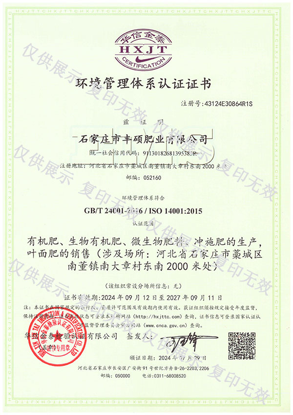石家莊市豐碩肥業(yè)有限公司是一家集新型肥料的研發(fā)、制造、營(yíng)銷(xiāo)、服務(wù)于一體的高新技術(shù)企業(yè),公司自2008年創(chuàng)辦以來(lái),一直致力于新型肥料的技術(shù)研發(fā)和市場(chǎng)推廣。公司組建了豐碩新型肥料研究中心(院士專(zhuān)家企業(yè)工作站),自主知識(shí)產(chǎn)權(quán)研發(fā)團(tuán)隊(duì)專(zhuān)業(yè)科研人員20余人,獲得了多項(xiàng)肥料國(guó)家發(fā)明專(zhuān)利。公司目前已擁有發(fā)酵類(lèi)有機(jī)肥、微生物菌劑、生物有機(jī)肥、土壤調(diào)理劑、大量元素水溶肥、含腐植酸肥料、含氨基酸肥料、中微量元素肥料等8大品類(lèi),“金維克”、“豐碩沃農(nóng)”等2大自有品牌,擁有20多個(gè)暢銷(xiāo)品種。目前,我公司已經(jīng)通過(guò)了“ISO9001 質(zhì)量管理體系認(rèn)證”、“ISO14001 環(huán)境管理體系認(rèn)證”、“OHSAS18001 職業(yè)健康管理體系認(rèn)證”。...